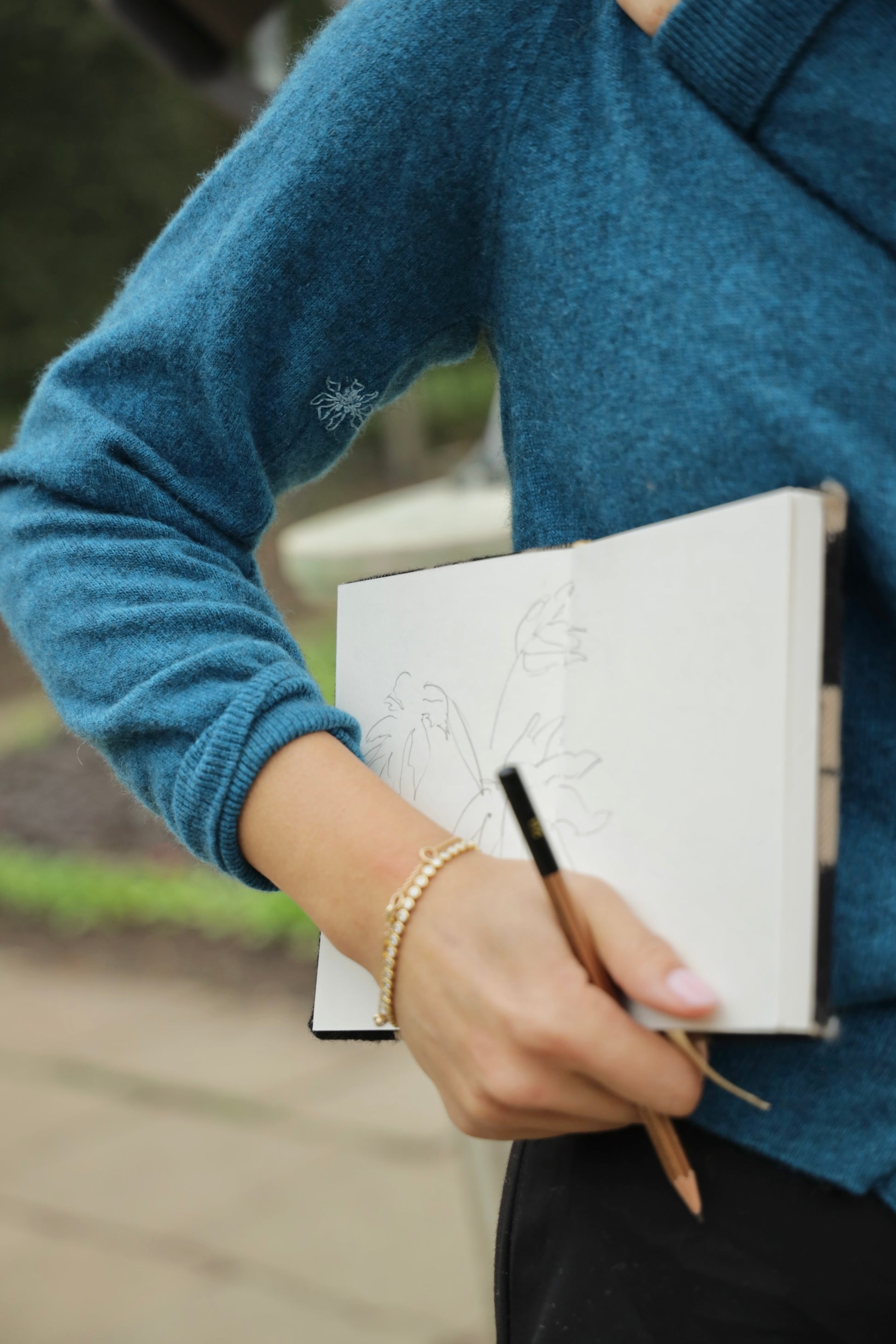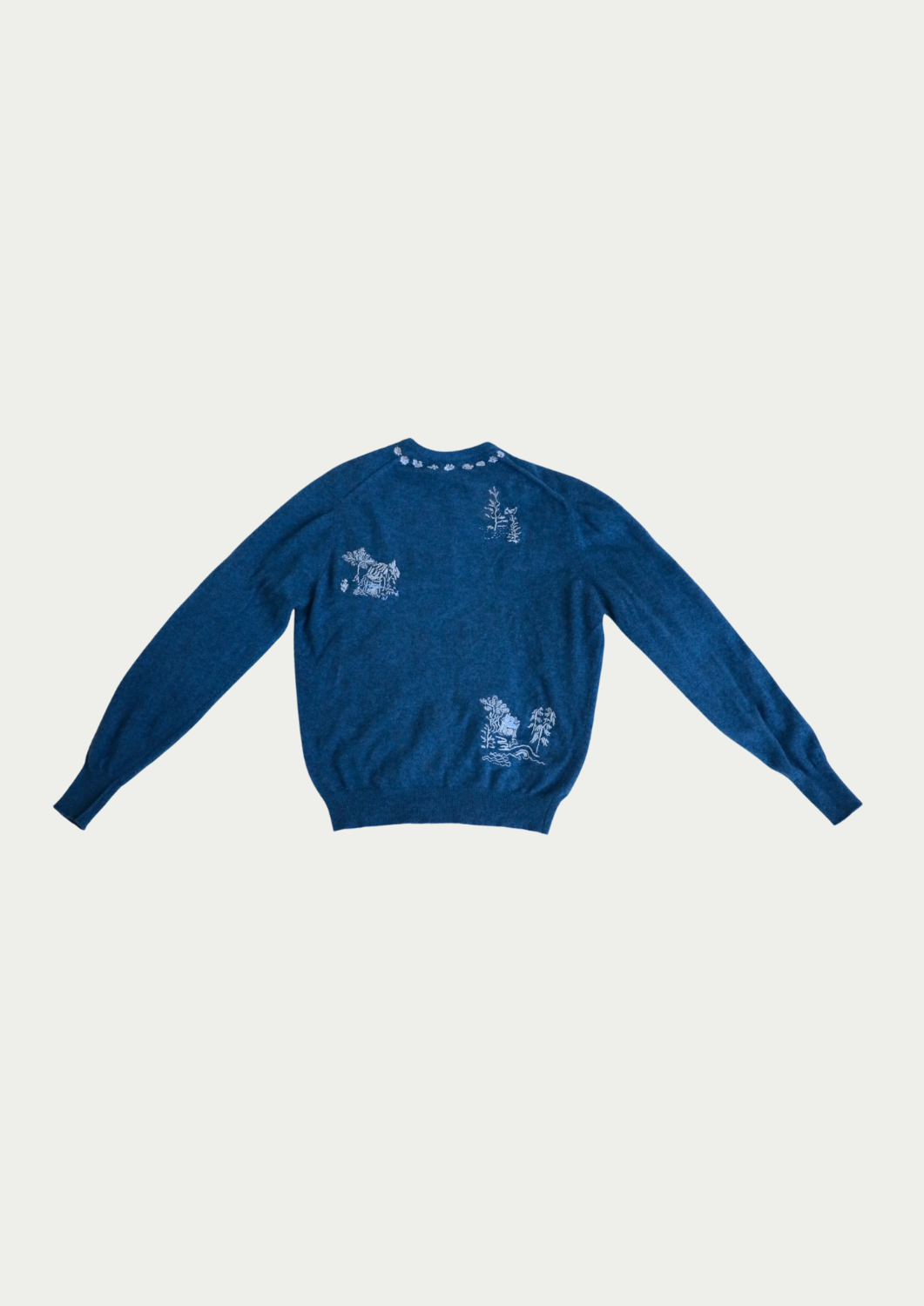 Cleaning, de-bobbling and tackling the odd moth hole with discreet embroidery (on the sleeve). The custom design is inspired by The Willow patterns that marry English heritage and Chinese antiques. We chose different shades of blue for the embroidery, to bring versatility to the cardigan and increase the number of ways to style it.
