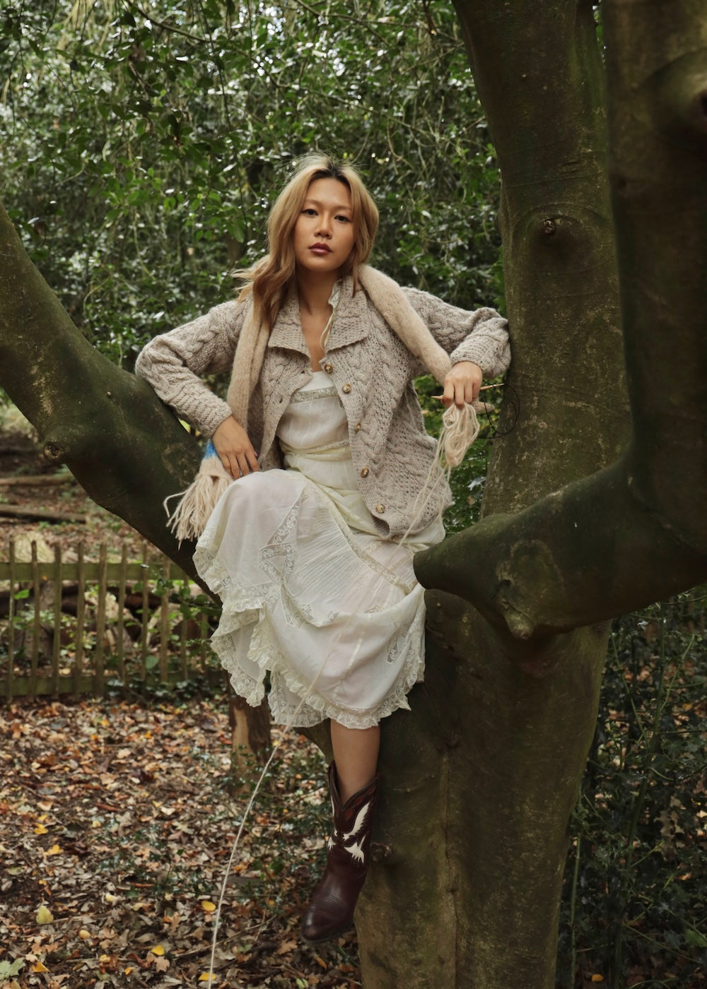 An adjustable cable knit wool cardigan, with mother of pearl buttons that can transform a cozy, long knit that's perfect for lounging, into a cropped style that can be worn with a maxi dress, cinched at waist.