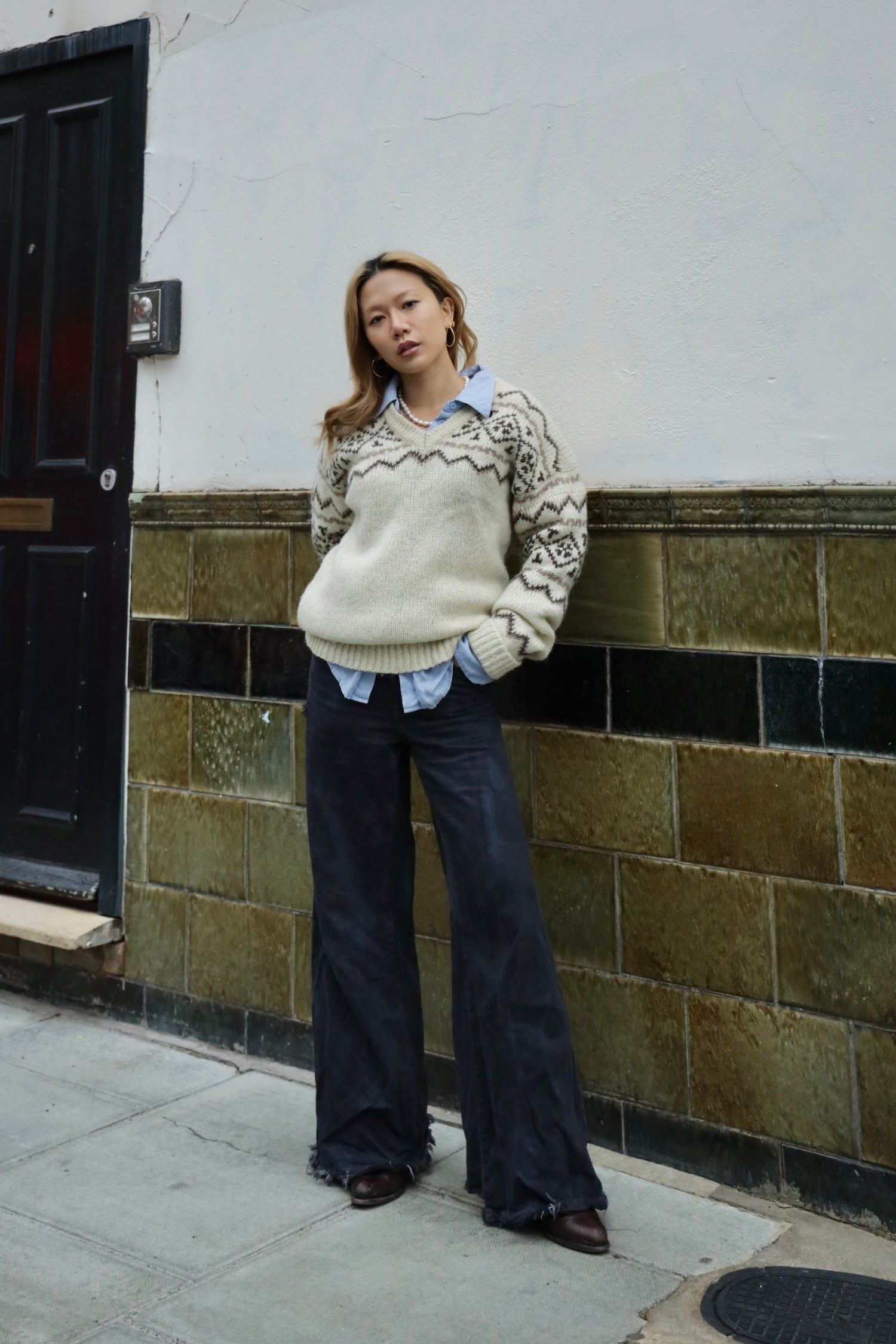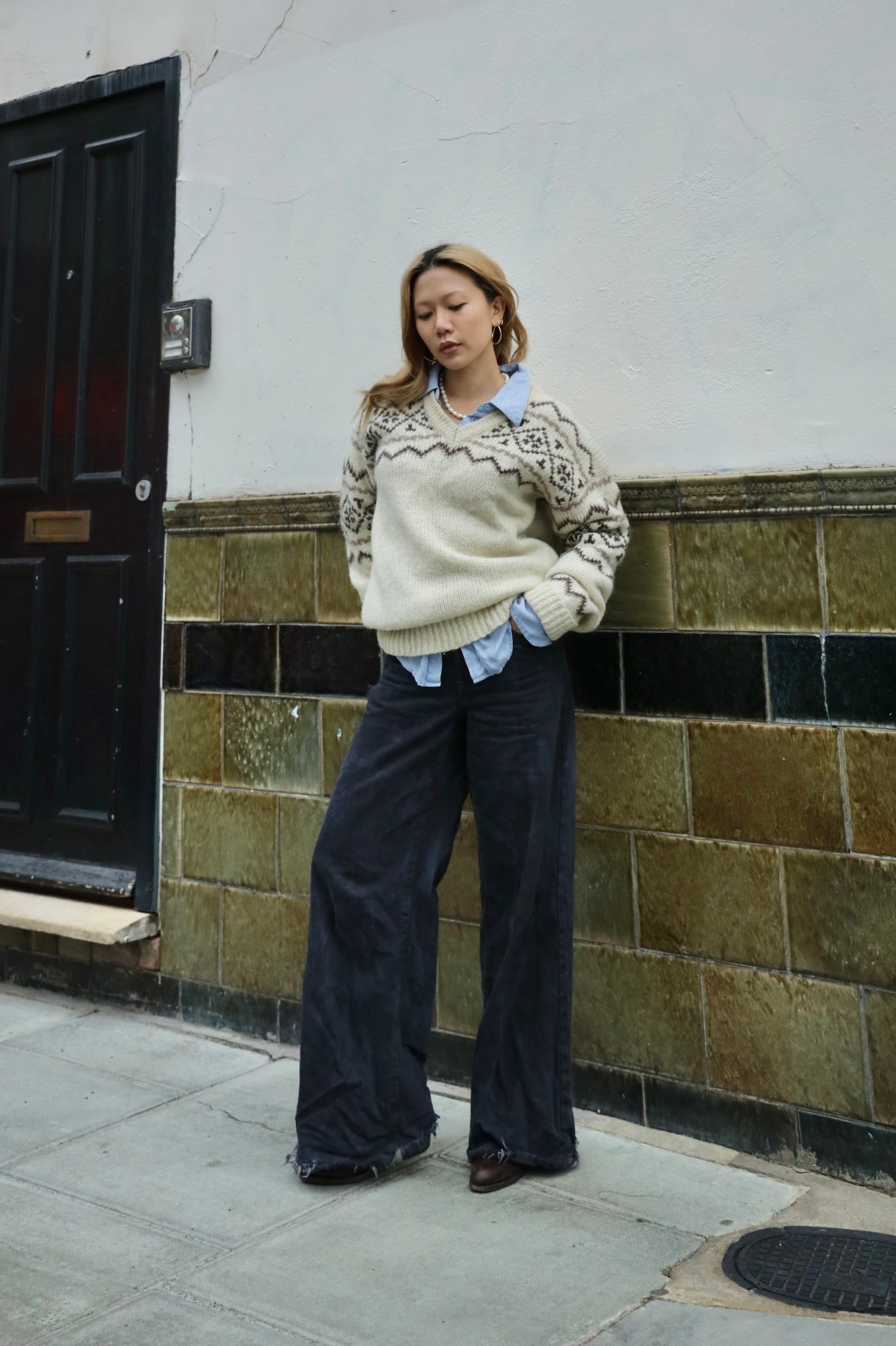 The most beautiful fairisle pattern in cream, chocolate brown and taupe. This chunky, heavy-weight knit can be styled loose over wide leg trousers to balance the length.